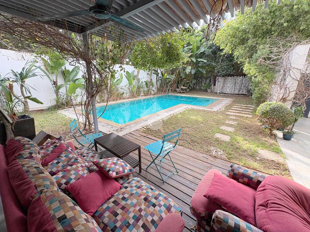 À l’entrée, vous découvrez un joli jardin avec piscine, puis un espace de vie composé d’un salon avec salle à manger, d’un séjour et d’un débarras.